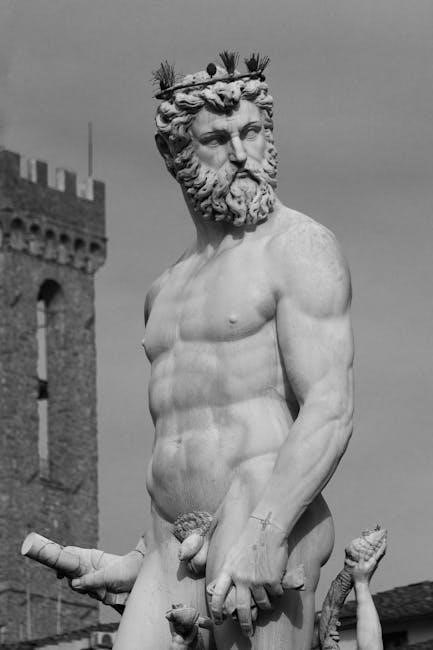 Poseidon, brother to Zeus and Hades, reigns over the seas, depicted with his trident and mastery over the ocean’s depths. The PDF version allows readers to explore these characters through the D’Aulaires’ distinctive illustrations and accessible storytelling, bringing these powerful gods to life for a younger audience.