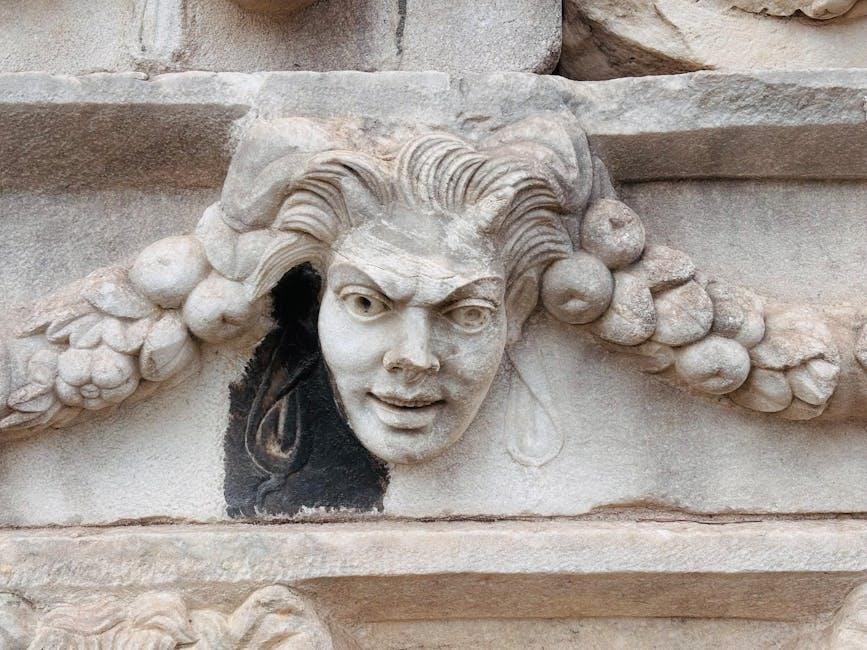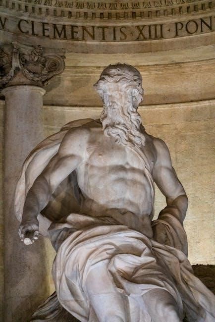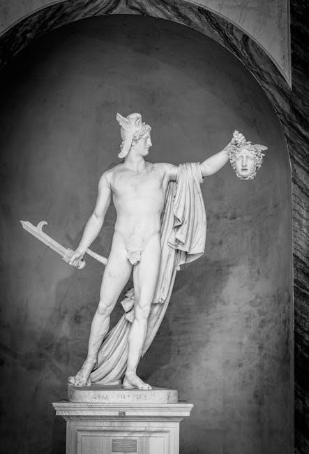 Theseus, known for conquering the Minotaur in the labyrinth, represents bravery and intelligence. The PDF format allows for easy access to these tales, showcasing the D’Aulaires’ skill in adapting complex myths into engaging stories.